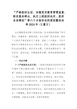 “严格组织生活、加强党员教育管理监督、联系服务群众、执行上级组织决定、抓好自身建设”等六个方面存在的原因整改材料2024年(2篇文)