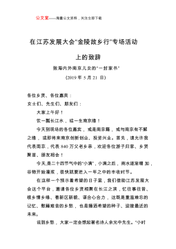 公文堂——海量公文资料,关注立即下载在江苏发展大会“金陵故乡行”专场活动上的致辞致海内外南京儿女的“一封家书”(2019年5月21日)各位乡贤、各位嘉宾:女士们、先生们、朋友们:大家上午好!饮一瓢长江水,结一生南京缘!今天到现场的各位嘉宾,或是南京籍,或与南京有不解之缘,或即将来南京创新创业、投资兴业。首先,请允许我代表南京,代表840万父老乡亲,欢迎各位游子归家、乡贤聚首、朋友相会!今天,是二十四节气中的“小满”,小满之后,雨水逐渐增加,谷物开始灌浆,很快就要进入一年之中的丰收时节。在这样一个预示着希望的日子里,我们借助江苏发展大会这个平台,邀请各位乡贤相聚在长江之滨,忆往事往昔、续乡情乡缘...