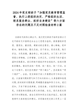 2024年党支部班子“加强党员教育管理监督、执行上级组织决定、严格组织生活、联系服务群众、抓好自身建设”等六方面存在的问题及不足对照检查材料2篇
