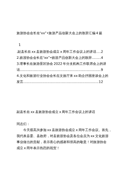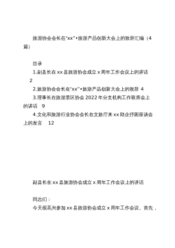 旅游协会会长在“xx”•旅游产品创新大会上的致辞汇编(4篇)目录1.副县长在xx县旅游协会成立x周年工作会议上的讲话22.旅游协会会长在“xx”•旅游产品创新大会上的致辞43.理事长在旅游景区协会2022年分支机构工作联席会上的讲话94.文化和旅游行业协会会长在文旅厅来xx助企抒困座谈会上的发言12副县长在xx县旅游协会成立x周年工作会议上的讲话同志们:今天很高兴参加xx县旅游协会成立x周年工作会议。首先,我代表县委、县政府,对县旅游协会及各位会员为xx文化旅游事业做出的贡献,表示衷心的感谢和崇高的敬意!对旅游协会成立x周年表示热烈的祝贺!参加今天的会议,我有“三个想不到”:一是想不到协会的会...