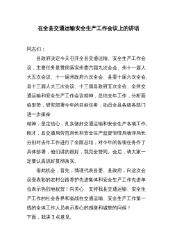 在全县交通运输安全生产工作会议上的讲话同志们:县政府决定今天召开全县交通运输、安全生产工作会议,主要任务是贯彻落实州委六届九次全会、州十一届人大五次会议、十一届州政府六次全会、县委十届六次全会、县十三届人大三次会议、十三届县政府五次全会、全州交通运输和安全生产工作会议精神,总结去年工作,分析面临形势,研究部署今年的目标任务,动员全县各级各部门进一步振奋精神,坚定信心,扎实做好交通运输和安全生产各项工作。刚才,县交通局劳范局长和安全生产监督管理局杨泽局长分别对去年工作进行了全面总结,对今年的各项任务作了具体部署,他们讲的很好,我完全赞同。会后,请大家一定要认真抓好贯彻落实。借此机会,首先,我谨代...