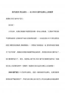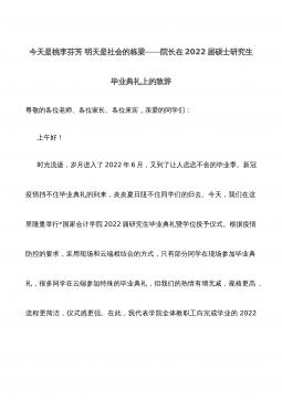 今天是桃李芬芳明天是社会的栋梁——院长在2022届硕士研究生毕业典礼上的致辞尊敬的各位老师、各位家长、各位来宾,亲爱的同学们:上午好!时光流逝,岁月进入了2022年6月,又到了让人恋恋不舍的毕业季。新冠疫情挡不住毕业典礼的到来,炎炎夏日阻不住同学们的归去。今天,我们在这里隆重举行*国家会计学院2022届研究生毕业典礼暨学位授予仪式。根据疫情防控的要求,采用现场和云端相结合的方式,只有部分同学在现场参加毕业典礼,很多同学在云端参加特殊的毕业典礼,但我们的热情有增无减,规格更高,流程更简洁,仪式感更强。在此,我代表学院全体教职工向完成学业的2022届毕业研究生和中外合作办学的IT审计研究生表示最衷...