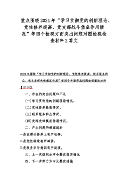 2024年深化理论武装、筑牢对党忠诚、锻炼过硬作风等五个方面专题组织生活会个人对照检查材料与纪检监察干部主题教育暨教育整顿专题组织生活会对照检查材料发言提纲【两篇文】2024年深化理论武装、筑牢对党忠诚、锻炼过硬作风、勇于担当作为、强化严管责任五个方面专题组织生活会个人对照检查材料提纲一、存在的主要问题(一)深化理论武装方面。(二)筑牢对党忠诚方面。(三)锻炼过硬作风方面。(四)勇于担当作为方面。(五)强化严管责任方面。二、产生问题的原因剖析一是理论学习用力不足。二是党性锻炼不够经常。三是理想信念培树不够。四是纪律作风要求不严。三、今后努力方向和整改措施(一)在理论武装上再加强。(二)在提振精...