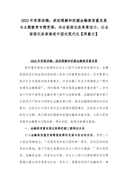 党课讲稿:深刻把握2023年中央金融工作会议精神要点与专题党课:学习党的XX大党章修改的九个要点,全面掌握党章要求,做合格党员【两篇】党课讲稿:深刻把握2023年中央金融工作会议精神要点金融高质量发展关系中国式现代化建设全局。在2023年中央金融工作会议上,习近平总书记在会上发表的重要讲话,科学回答了金融事业发展的一系列重大理论和实践问题,是习近平经济思想的重要组成部分,是马克思主义政治经济学关于金融问题的重要创新成果,习近平总书记从党和国家事业发展全局的战略高度,部署当前和今后一个时期的金融工作,为新时代新征程推动金融高质量发展提供了根本遵循和行动指南。一、坚定一条道路:坚定不移走中国特色金...