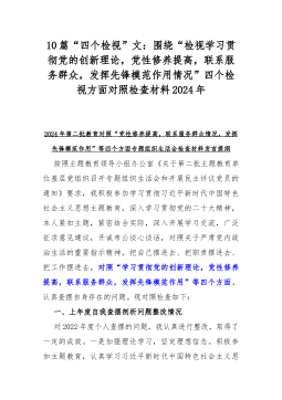 七篇文:围绕2024年“检视联系服务群众情况,看为身边群众做了什么实事好事,还有哪些差距,看学了多少、学得怎样,有什么收获和体会”等“四个检视”方面突出问题检视整改材料[目录]1.2024年学习贯彻党的创新理论情况,看学了多少、学得怎么样,有什么收获和体会四个检视对照检查材料2.2024年第二批教育专题围绕“学习贯彻党的创新理论、党性修养提高、联系服务群众、党员发挥先锋模范作用”四个方面组织生活会对照检查材料3330字文3.2024年围绕“学习贯彻党的创新理论、党性修养提高、联系服务群众、党员发挥先锋模范作用”等个四个方面突出问题检视整改材料2980字范文4.2024年“联系服务群众、党员发挥...