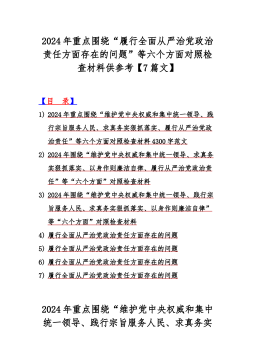 2024年重点围绕“履行全面从严治党政治责任方面存在的问题”等六个方面对照检查材料供参考【7篇文】【目录】1)2024年重点围绕“维护党中央权威和集中统一领导、践行宗旨服务人民、求真务实狠抓落实、履行从严治党政治责任”等六个方面对照检查材料4300字范文2)2024年围绕“维护党中央权威和集中统一领导、求真务实狠抓落实、以身作则廉洁自律、履行从严治党政治责任”等“六个方面”对照检查材料3)2024年围绕“维护党中央权威和集中统一领导、践行宗旨服务人民、求真务实狠抓落实、以身作则廉洁自律”等“六个方面”对照检查材料4)履行全面从严治党政治责任方面存在的问题5)履行全面从严治党政治责任方面存在的问...
