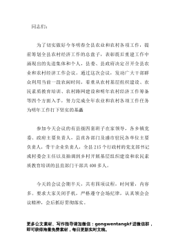 同志们: 为了切实做好今冬明春全县农业和农村各项工作,提前筹划全县农村经济工作的总盘子,表彰震后重建工作中涌现出的先进集体和个人,县委、县政府决定召开全县农业和农村经济工作会议。通过这次会议,发动广大干部群众利用当前一段农闲时间,着重从农村基层组织建设、农民素质教育培训、农村路网建设和明年农村经济工作筹备等四个方面入手,努力完成全年农业和农村各项工作任务为明年工作打下坚实的基矗 参加今天会议的有县级四套班子在家领导,各乡镇党委、政府主要负责人,县直各部门及盛市驻民各单位主要负责人,骨干企业负责人,全县215个行政村的党支部书记或村委会主任以及抽调到乡村开展基层组织建设和农民素质教育培训的...