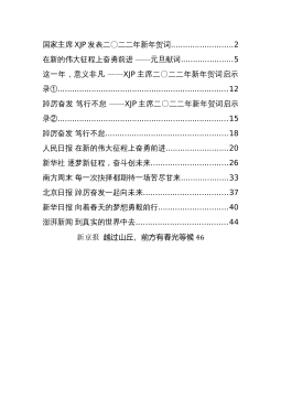 国家主席XJP发表二〇二二年新年贺词..........................2在新的伟大征程上奋勇前进——元旦献词......................5这一年,意义非凡——XJP主席二〇二二年新年贺词启示录①.......................................................................12踔厉奋发笃行不怠——XJP主席二〇二二年新年贺词启示录②.......................................................................15踔厉奋发笃行不怠.......