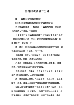 坚持的演讲稿三分钟篇一:幽默3分钟演讲稿范文20XX三分钟幽默演讲稿三分钟幽默演讲稿三分钟幽默演讲,一般是以一个幽默的故事,来呈现一个内涵的人生道理。下面是第一公文整理三分钟幽默演讲稿三分钟幽默演讲稿飞机在一阵剧烈的颤抖之后,空中小姐突然表情凝重地为每个乘客都发了一张纸和一枝笔,随后,机长那浑厚而压抑的声音出现在广播里:很不幸地告诉大家一个消息,由于飞机出现故障,将在4分钟后坠毁,请大家尽快书写遗言,交给乘务员。否则,您将失去与亲人的最后一次联系机会!人们把脸贴到窗上往外看,没错,正往上飞的云告诉他们飞机正在跌落。天哪!机舱中一片骚动,几个女人开始哭泣。请抓紧时间吧!机长再次催促。人们无奈地握...