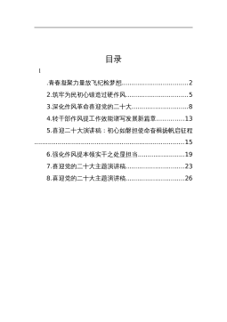 目录1.喜迎二十大,奋进新征程52.奋斗,人生因奋斗而精彩.......................................123.从井冈山斗争史看百年党史.....................................174.立足新起点、展现新作为.......................................285.从党的纪律建设丰富实践中汲取智慧和力量.......................336.争做敢担当善作为的合格党员...................................427.牢记中国共产党是什么、要干什么...........
