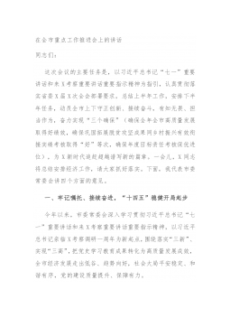 在全市重点工作推进会上的讲话同志们:这次会议的主要任务是,以习近平总书记“七一”重要讲话和来X考察重要讲话重要指示精神为指引,认真贯彻落实省委X届X次全会部署要求,总结上半年工作,安排下半年任务,动员全市上下守正创新、接续奋斗,有知无畏、担当作为,奋力实现“三个确保”(确保全年全市高质量发展取得好绩效,确保巩固拓展脱贫攻坚成果同乡村振兴有效衔接实绩考核取得“好”等次,确保年度目标责任考核保优进位),为X新时代追赶超越谱写新的篇章。一会儿,X同志将总结安排经济工作,请大家抓好落实。下面,我代表市委常委会讲四个方面的意见。一、牢记嘱托、接续奋进,“十四五”稳健开局起步今年以来,市委常委会深入学习贯...