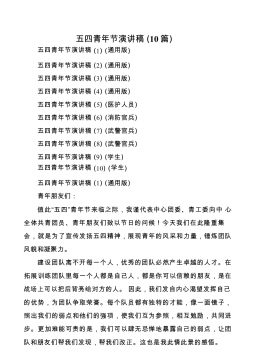 五四青年节演讲稿(10篇)五四青年节演讲稿(1)(通用版)五四青年节演讲稿(2)(通用版)五四青年节演讲稿(3)(通用版)五四青年节演讲稿(4)(通用版)五四青年节演讲稿(5)(医护人员)五四青年节演讲稿(6)(消防官兵)五四青年节演讲稿(7)(武警官兵)五四青年节演讲稿(8)(武警官兵)五四青年节演讲稿(9)(学生)五四青年节演讲稿(10)(学生)五四青年节演讲稿(1)(通用版)青年朋友们:值此“五四”青年节来临之际,我谨代表中心团委、青工委向中心全体共青团员、青年朋友们致以节日的问候!今天我们在此隆重集会,就是为了宣传发扬五四精神,展现青年的风采和力量,锤炼团队风貌和凝聚力。建设团队离不开...