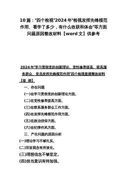 重点围绕“以身作则、廉洁自律、践行宗旨服务人民,以身作则廉洁自律、维护党中央权威和集中统一领导”等存在的种种问题与新六个方面对照材料10篇文【供参考2024年】【目录】(1)2024年围绕“维护党中央权威和集中统一领导、践行宗旨服务人民、以身作则廉洁自律、履行从严治党政治责任”等“六个方面”对照检查材料4510字范文(2)2024年围绕“维护党中央权威和集中统一领导、践行宗旨服务人民、求真务实狠抓落实、以身作则廉洁自律”等“六个方面”对照检查材料4340字范文(3)2024年围绕“维护党中央权威和集中统一领导、践行宗旨服务人民、求真务实狠抓落实、履行从严治党政治责任”等“六个方面”对照检查材料...