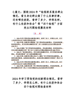七篇文:围绕2024年“检视联系服务群众情况,看为身边群众做了什么实事好事,还有哪些差距,看学了多少、学得怎样,有什么收获和体会”等“四个检视”方面突出问题检视整改材料[目录]1.2024年学习贯彻党的创新理论情况,看学了多少、学得怎么样,有什么收获和体会四个检视对照检查材料2.2024年第二批教育专题围绕“学习贯彻党的创新理论、党性修养提高、联系服务群众、党员发挥先锋模范作用”四个方面组织生活会对照检查材料3330字文3.2024年围绕“学习贯彻党的创新理论、党性修养提高、联系服务群众、党员发挥先锋模范作用”等个四个方面突出问题检视整改材料2980字范文4.2024年“联系服务群众、党员发挥...