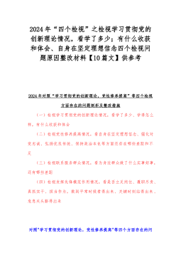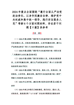 2024年重点全面围绕“履行全面从严治党政治责任,以身作则廉洁自律、维护党中央权威和集中统一领导、践行宗旨服务人民”等新6个方面对照材料、存在若干问题【十篇】供参考【目录】(一)2024年重点围绕“维护党中央权威和集中统一领导、践行宗旨服务人民、求真务实狠抓落实、以身作则廉洁自律、履行从严治党政治责任”等六个方面对照检查材料4630字范文(二)2024年重点围绕“维护党中央权威和集中统一领导方面”问题清单10条汇编【供参考】(三)2024年重点围绕“践行宗旨服务人民、求真务实狠抓落实、以身作则廉洁自律、履行从严治党政治责任”等六个方面对照检查材料3830字范文(四)2024年重点围绕“践行宗旨...