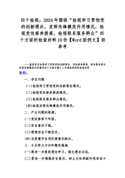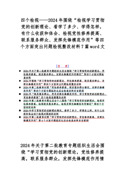 四个检视——2024年围绕“检视学习贯彻党的创新理论、看学了多少、学得怎样,有什么收获和体会、检视党性修养提高、联系服务群众、发挥先锋模范作用”等四个方面突出问题检视整改材料7篇word文[目录]2024年关于第二批教育专题组织生活会围绕“学习贯彻党的创新理论,党性修养提高,联系服务群众,发挥先锋模范作用情况”等四个方面对照检查材料2024年围绕“学习贯彻党的创新理论、党性修养提高、联系服务群众、发挥先锋模范作用”等四个方面突出问题检视整改材料2024年第二批教育对照“党性修养提高,联系服务群众情况,发挥先锋模范作用”等四个方面专题组织生活会检查材料发言提纲2024年“联系服务群众、党...
