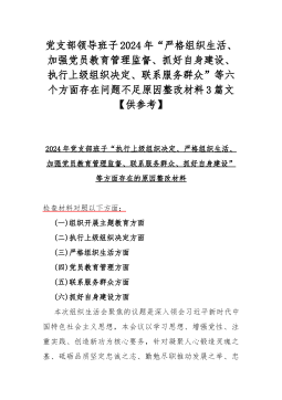 党支部领导班子2024年“严格组织生活、加强党员教育管理监督、抓好自身建设、执行上级组织决定、联系服务群众”等六个方面存在问题不足原因整改材料3篇文【供参考】