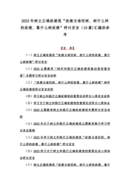2篇:2023年树立和践行正确政绩观的重要论述“政绩为谁而树、树什么样的政绩、靠什么树政绩”研讨心得发言材料2023年主题教育树立和践行正确的政绩观专题研讨发言材料习近平总书记说过,必须把为民造福作为最重要的政绩。广大党员干部必须牢固树立和践行正确政绩观,要把为民办事、为民造福,解决群众的急难愁盼作为我们工作的出发点和落脚点。用实际行动践行对党绝对忠诚。纪检监察机关是党和国家监督专责机关,要忠诚于党、忠于人民,带头加强党的政治建设,继承对党绝对忠诚的光荣传统,做忠诚干净担当、敢于善于斗争的战士。要坚定不移正风肃纪反腐,确保党和人民赋予的权力不被滥用,惩恶扬善的利剑永不蒙尘,着力解决人民群众急难...