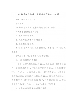 XX基层单位2022年工作会议暨党委(扩大)会议六届一次职代会主持词各位代表、同志们:2022年工作会议暨党委(扩大)会议、六届一次职工代表大会,应到所有代表77人,实到72人;其中应到正式职工代表50人,因公、因事请假2人,实到职工代表48人,符合法定人数,可以开会。我们这次大会的主要任务是:贯彻落实上级单位“三会”精神,听取和审议XX工作报告、干部选拔任用情况报告;听取XX领导干部述职和进行民主测评;表彰2021年度先进集体和个人;现场签订2022年度集体合同。会后,与会代表将围绕工作报告、2022年绩效考核管理办法以及下一步的技术研发、市场开发等大家关心的问题进行讨论,并签订绩效合同、安...
