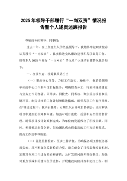 2025年领导干部履行“一岗双责”情况报告暨个人述责述廉报告尊敬的各位领导、同事们:过去一年,在上级党组织的坚强领导下,我始终牢记职责使命认真履行“一岗双责”,扎实推进党风廉政建设和各项业务工作。现将本人2025年履行“一岗双责”情况及个人廉洁自律情况报告如下:一、扛责在肩,统筹兼顾显担当(一)聚焦核心任务,力促工作落实。2025年,我紧紧围绕单位的中心工作和年度目标任务,明确职责分工,将党风廉政建设与业务工作同部署、同落实、同检查、同考核。聚焦重点项目和关键环节,制定详细的工作计划和推进措施,确保各项工作有序开展。在*推进过程中,我亲自挂帅,定期组织召开项目协调会,及时解决项目中遇到的困难和问题。加强对项目进度、质量和安全的监督管理,确保项目按计划顺利完成,为单位的发展做出了积极贡献。同时...