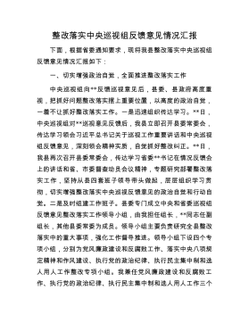 整改落实中央巡视组反馈意见情况汇报下面,根据省委通知要求,现将我县整改落实中央巡视组反馈意见情况汇报如下:一、切实增强政治自觉,全面推进整改落实工作中央巡视组向**反馈巡视意见后,县委、县政府高度重视,把抓好问题整改落实摆上重要位置,以高度的政治自觉,一着不让抓好整改落实工作。一是迅速组织传达学习。**日,中央巡视组对**巡视意见反馈后,我县立即召开县委常委会,传达学习领会习近平总书记关于巡视工作重要讲话和中央巡视组反馈意见,深刻领会精神实质,自觉抓好整改纠正。**日,我县再次召开县委常委会,传达学习省委**书记在情况反馈会上的讲话和省、市委督查动员会议精神,专题研究部署整改落实工作,坚持从县...
