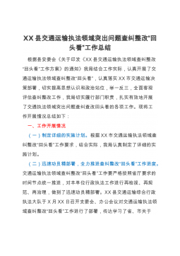 XX县交通运输执法领域突出问题查纠整改“回头看”工作总结根据县安委会《关于印发《XX县交通运输执法领域查纠整改“回头看”工作方案》的通知》我局结合工作实际,认真开展了交通运输执法领域查纠整改“回头看”,认真落实XX市交通运输决策部署,切实提高思想认识和政治站位,举一反三,全面客观评估查纠整改工作,我局切实履行部门职责,扎实有效地开展了交通执法领域突出问题查纠查改回头看的各项工作。现将工作开展情况总结如下:一、工作开展情况(一)制定详细的实施计划。根据XX市交通运输执法领域查纠整改“回头看”工作要求,结合实际,我局认真制定了详细的实施计划。(二)迅速动员精部署,全力推进查纠整改“回头看”工作进度...