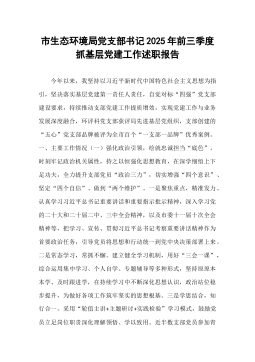 市生态环境局党支部书记2025年前三季度抓基层党建工作述职报告今年以来,我坚持以习近平新时代中国特色社会主义思想为指引,坚决落实基层党建第一责任人责任,自觉对标“四强”党支部建设要求,持续推动支部党建工作提质增效,实现党建工作与业务发展深度融合,环评科党支部获评局先进基层党组织,支部创建的“五心”党支部品牌被评为全市百个“一支部一品牌”优秀案例。一、主要工作情况(一)强化政治引领,绘就忠诚担当“底色”。时刻牢记政治机关属性,持之以恒强化思想教育,在深学细悟上下足功夫,全力提升支部党员“政治三力”,切实增强“四个意识”、坚定“四个自信”、做到“两个维护”。一是聚焦重点,精准发力。认真学习习近平总书记重要讲话和重要指示批示精神,深入学习党的二十大和二十届二中、三中全会精神,以及市委十一届十次全会...