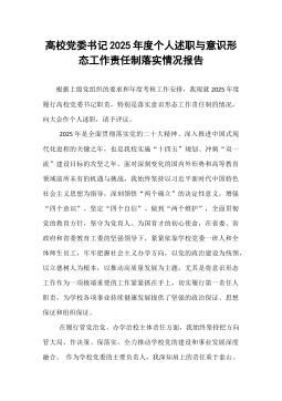 高校党委书记2025年度个人述职与意识形态工作责任制落实情况报告根据上级党组织的要求和年度考核工作安排,我现就2025年度履行高校党委书记职责,特别是落实意识形态工作责任制的情况,向大会作个人述职,请予评议。2025年是全面贯彻落实党的二十大精神、深入推进中国式现代化进程的关键之年,也是我校实施“十四五”规划、冲刺“双一流”建设目标的攻坚之年。面对深刻变化的国内外形势和高等教育领域前所未有的机遇与挑战,我始终坚持以习近平新时代中国特色社会主义思想为指导,深刻领悟“两个确立”的决定性意义,增强“四个意识”、坚定“四个自信”、做到“两个维护”,全面贯彻党的教育方针,坚守为党育人、为国育才的初心使命,在省委、省政府和省委教育工委的坚强领导下,紧紧依靠学校党委一班人和全体师生员工,牢牢把握社会主义办...