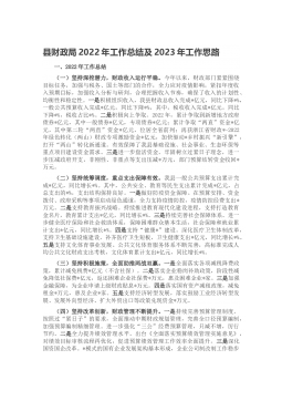 县财政局2022年工作总结及2023年工作思路一、2022年工作总结(一)坚持深挖潜力,财政收入运行平稳。今年以来,财政部门紧紧围绕目标任务,加强与税务、国土等部门的合作,全力应对疫情影响,紧扣年度收入预期目标,加强收入分析与研判,合理把握收入节奏,确保了收入的计划性、均衡性和稳定性。一是积极组织收入,我县财政总收入完成*亿元,同比下降*%,一般公共预算收入完成*亿元,同比下降*%,其中,税收收入完成*亿元,同比下降*%,税收占比*%。二是积极向上争取。2022年,累计争取到新增地方政府债券*亿元,其中一般债券*亿元,专项债券*亿元;累计争取“两直”资金*亿元,其中第二轮“两直”资金*亿元,位...