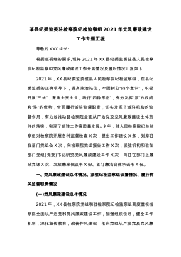 某县纪委监委驻检察院纪检监察组2021年党风廉政建设工作专题汇报尊敬的XXX组长:根据巡视组的要求,现将2021年XX县纪委监委驻县人民检察院纪检监察组党风廉政建设工作开展情况及履职情况汇报如下:2021年,XX县纪委监委驻县人民检察院纪检监察组,在县纪委监委的正确领导下,提高政治站位,牢固树立“四个意识”,积极开展“三转”,聚焦主责主业,践行“四种形态”,充分发挥“派”的权威和“驻”的优势,全面履行派驻监督职责,切实发挥了派驻机构的监督作用,有力地推动县检察院全面从严治党及党风廉政建设主体责任的落实,实现了派驻工作高质量发展。全年,驻人民检察院纪检监察组对检察院开展各种监督检查X次,提出工作...