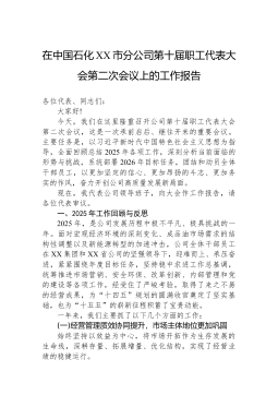 在中国石化XX市分公司第十届职工代表大会第二次会议上的工作报告各位代表、同志们:大家好!今天,我们在这里隆重召开公司第十届职工代表大会第二次会议,这是一次承前启后、继往开来的重要会议。主要任务是,以习近平新时代中国特色社会主义思想为指导,全面回顾总结2025年各项工作,深刻分析当前面临的形势与挑战,系统部署2026年目标任务,团结和动员全体干部员工,以更加坚定的信心、更加昂扬的斗志、更加务实的作风,奋力开创公司高质量发展新局面。现在,我代表公司领导班子,向大会作工作报告,请各位代表审议。一、2025年工作回顾与反思2025年,是公司发展历程中极不平凡、极具挑战的一年。面对宏观经济环境的深刻变化、成品油市场需求的结构性调整以及新能源转型的加速冲击,公司全体干部员工在XX集团和XX省公司的坚强领...