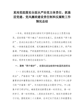 某局党组落实全面从严治党主体责任、抓基层党建、党风廉政建设责任制和反腐败工作情况总结一年来,局党组坚持以新时代中国特色社会主义思想为指导,深刻领悟“两个确立”的决定性意义,坚决做到“两个维护”,坚决扛起全面从严治党主体责任,以党的政治建设为统领,一体推进基层党建、党风廉政建设和反腐败工作,将严的基调、严的措施、严的氛围贯穿民政工作全过程各方面,为推动新时代民政事业改革发展提供了坚强有力的政治保证和纪律保证。现将有关情况总结报告如下:一、聚焦“两个维护”,在强化政治统领中彰显民政担当(一)深化理论武装,筑牢思想根基。一是坚持“首题必政治”。严格落实“第一议题”制度,将学习贯彻总书记最新重要讲话和重要指示批示精神作为党组会、理论学习中心组学习的“开篇第一课”,年内组织党组会专题学习*次,中心组集...