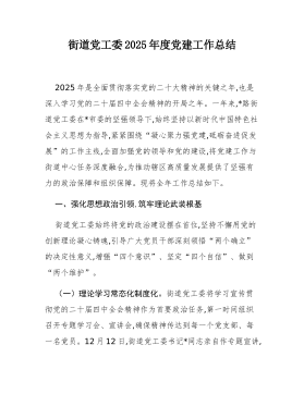 街道党工委2025年度党建工作总结2025年是全面贯彻落实党的二十大精神的关键之年,也是深入学习党的二十届四中全会精神的开局之年。一年来,*路街道党工委在*市委的坚强领导下,始终坚持以新时代中国特色社会主义思想为指导,紧紧围绕“凝心聚力强党建,砥砺奋进促发展”的工作主线,全面加强党的领导和党的建设,将党建工作与街道中心任务深度融合,为推动辖区高质量发展提供了坚强有力的政治保障和组织保障。现将全年工作总结如下。一、强化思想政治引领,筑牢理论武装根基街道党工委始终将党的政治建设摆在首位,坚持不懈用党的创新理论凝心铸魂,引导广大党员干部深刻领悟“两个确立”的决定性意义,增强“四个意识”、坚定“四个自信”、做到“两个维护”。(一)理论学习常态化制度化。街道党工委将学习宣传贯彻党的二十届四中全会精神作...