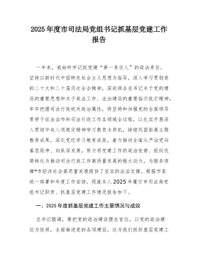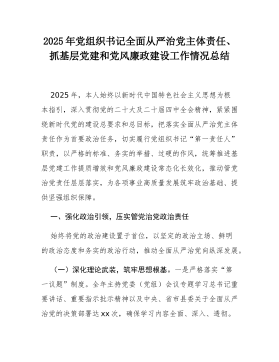 2025年党组织书记全面从严治党主体责任、抓基层党建和党风廉政建设工作情况总结2025年,本人始终以新时代中国特色社会主义思想为根本指引,深入贯彻党的二十大及二十届四中全会精神,紧紧围绕新时代党的建设总要求和总目标,把落实全面从严治党主体责任作为首要政治任务,切实履行党组织书记“第一责任人”职责,以严格的标准、务实的举措、过硬的作风,统筹推进基层党建工作提质增效和党风廉政建设常态化长效化,推动管党治党责任层层落实,为各项事业高质量发展筑牢政治基础、提供坚强组织保障。一、强化政治引领,压实管党治党政治责任始终将党的政治建设置于首位,以坚定的政治立场、鲜明的政治态度和务实的政治行动,推动全面从严治党向纵深发展。(一)深化理论武装,筑牢思想根基。一是严格落实“第一议题”制度。全年主持党委(党组)会...