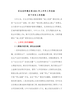 区生态环境分局2021年上半年工作总结和下半年工作思路今年以来,区生态环境分局紧紧围绕“海上花园”建设目标,坚持“生态立区”战略,深入践行“绿水青山就是金山银山”的理念,全力落实中央生态环境保护督察问题整改,扎实推进生态文明建设,区城环境质量得到稳步提升。今年X-X月份,空气质量优良率X%,较去年同期上升%,集中式饮用水源地水质达标率均达X%,为高质量建设“海上花园”提供优良生态环境支撑。一、上半年工作开展情况(一)聚焦示范引领,深化生态创建一是争创国家生态文明建设示范区,开展生态文明建设规划修编。启动绿色生产、生活创建试点,出台绿色创建方案,谋划半屏绿色生产生活示范岛建设,开展白迭无污染村建...