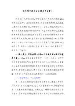 卫生局年终总结会领导讲话篇1同志们:“风雨送春归,飞雪迎春到”。再过几天就是20xx年的元旦佳节了。在这万象更新、辞旧迎新的时刻,我代表县卫生局向在座的各位,并通过你们向全县卫生战线的全体工作人员及其家属致以新春的问候!向坚守岗位和为卫生事业改革和发展做出贡献的所有卫生工作者表示最诚挚的新年祝福!卓有成效的20xx年即将过去,前景辉煌的20xx年即将来临。“一年之计在于春,一日之计在于晨”。下面,我就20xx年的工作,先作一个简单的总结,并对20xx年的重要工作,提前作一下安排。一、凝心聚力,团结奋进,创造**卫生事业新成就团结就是力量。今年**县卫生事业获得了一个又一个成功,创下了前所未有的...
