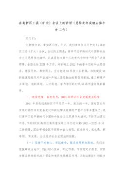 在高新区工委(扩大)会议上的讲话(总结去年成绩安排今年工作)同志们:今朝胜往昔,蓄势再出发。今天,我们在这里召开中共XX高新区工委(扩大)会议,会议的主题是:高举习近平新时代中国特色社会主义思想伟大旗帜,认真贯彻市第十三次党代会和市“两会”决策部署,全面总结2021年工作,科学确立2022年的奋斗目标和主要任务,继往开来,乘势而上,全力打造XX科技工业新城,加快建设XX新能源智能汽车产业城和产城人深度融合的高品质新城,着力构建产业高地、创新高地、人才高地,奋力谱写新时代XX高质量发展新篇章。一、攻坚克难,奋发有为,2021年经济社会发展亮点纷呈2021年是我们高新区不平凡的一年,难忘的一年,面...