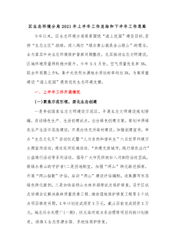 区生态环境分局2021年上半年工作总结和下半年工作思路今年以来,区生态环境分局紧紧围绕“海上花园”建设目标,坚持“生态立区”战略,深入践行“绿水青山就是金山银山”的理念,全力落实中央生态环境保护督察问题整改,扎实推进生态文明建设,区城环境质量得到稳步提升。今年X-X月份,空气质量优良率X%,较去年同期上升%,集中式饮用水源地水质达标率均达X%,为高质量建设“海上花园”提供优良生态环境支撑。一、上半年工作开展情况(一)聚焦示范引领,深化生态创建一是争创国家生态文明建设示范区,开展生态文明建设规划修编。启动绿色生产、生活创建试点,出台绿色创建方案,谋划半屏绿色生产生活示范岛建设,开展白迭无污染村建...