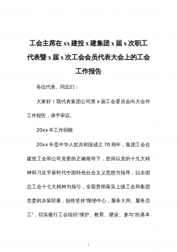 工会主席在xx建投x建集团x届x次职工代表暨x届x次工会会员代表大会上的工会工作报告各位代表、同志们:大家好!我代表集团公司第x届工会委员会向大会作工作报告,请予审议。20xx年工作回顾20xx年是中华人民共和国成立70周年,集团工会在建投工会和公司党委的正确领导下,坚持以党的十九大精神和习近平新时代中国特色社会主义思想为指导,以全国总工会十七大精神为指引,全面贯彻落实上级工会和集团党委的决策部署,始终坚持“围绕中心,服务大局、服务员工”,切实履行工会组织“维护、教育、建设、参与”的基本·1职能,团结动员广大工会干部卓有成效地开展各项工作,为集团公司全年工作任务和“十三五”战略目标实现奠定了坚...