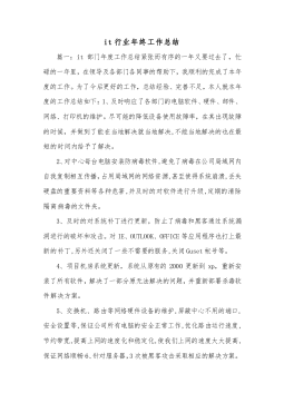 it行业年终工作总结篇一:it部门年度工作总结紧张而有序的一年又要过去了,忙碌的一年里,在领导及各部门各同事的帮助下,我顺利的完成了本年度的工作。为了今后更好的工作,总结经验、完善不足,本人就本年度的工作总结如下:1、及时响应了各部门的电脑软件、硬件、邮件、网络、打印机的维护。尽可能的降低设备使用故障率,在其出现故障的时候,并做到了能在当地解决就当地解决,不能当地解决的也在最短的时间内给予了解决。2、对中心每台电脑安装防病毒软件,避免了病毒在公司局域网内自我复制相互传播,占用局域网的网络资源,甚至使得系统崩溃,丢失硬盘的重要资料等各种危害,并及时的对软件进行升级,定期的清除隔离病毒的文件夹。3...