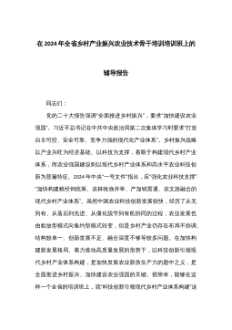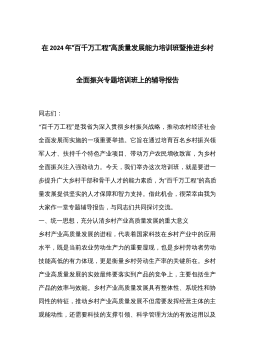 在2024年“百千万工程”高质量发展能力培训班暨推进乡村全面振兴专题培训班上的辅导报告同志们:“百千万工程”是我省为深入贯彻乡村振兴战略,推动农村经济社会全面发展而实施的一项重要举措。它旨在通过培育百名乡村振兴领军人才、扶持千个特色产业项目、带动万户农民增收致富,为乡村全面振兴注入强劲动力。今天,我们举办这次培训班,就是要进一步提升广大乡村干部和骨干人才的能力素质,为“百千万工程”的高质量发展提供坚实的人才保障和智力支持。借此机会,很荣幸由我为大家作一堂专题辅导报告,与同志们共同探讨交流。一、统一思想,充分认清乡村产业高质量发展的重大意义乡村产业高质量发展的进程,代表着国家科技在乡村产业中的应...