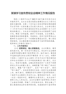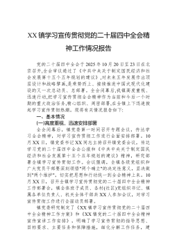 XX镇学习宣传贯彻党的二十届四中全会精神工作情况报告党的二十届四中全会于2025年10月20日至23日在北京召开,全会审议通过了《中共中央关于制定国民经济和社会发展第十五个五年规划的建议》,对未来五年发展作出顶层设计和战略擘画,是乘势而上、接续推进中国式现代化建设的又一次总动员、总部署。全会闭幕后,我镇高度重视、迅速行动,把学习宣传贯彻全会精神作为当前和今后一个时期的重大政治任务,精心组织、周密部署,在全镇上下迅速掀起学习宣传贯彻热潮。现将有关情况报告如下:一、基本情况(一)高度重视,迅速安排部署全会闭幕后,镇党委第一时间召开专题会议,传达学习全会精神,对学习宣传贯彻工作进行全面安排部署。10月XX日,镇党委书记XX同志主持召开镇党委会议,传达学习党的二十届四中全会公报和《中共中央关于制定国...