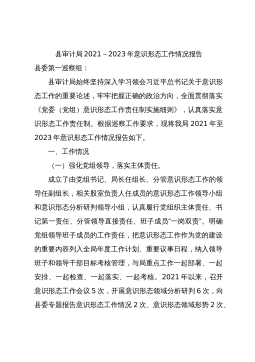 县审计局2021-2023年意识形态工作情况报告县委第一巡察组:县审计局始终坚持深入学习领会习近平总书记关于意识形态工作的重要论述,牢牢把握正确的政治方向,全面贯彻落实《党委(党组)意识形态工作责任制实施细则》,认真落实意识形态工作责任制。根据巡察工作要求,现将我局2021年至2023年意识形态工作情况报告如下。一、工作情况(一)强化党组领导,落实主体责任。成立了由党组书记、局长任组长、分管意识形态工作的领导任副组长,相关股室负责人任成员的意识形态工作领导小组和意识形态分析研判领导小组,认真履行党组织主体责任、书记第一责任、分管领导直接责任、班子成员“一岗双责”。明确党组领导班子成员的工作责任...