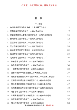 公文堂公文写作之家,体制人加油站目录一、党委1.各级党组织学习贯彻党的二十大精神工作总结12.江苏省学习宣传贯彻二十大精神工作总结73.安徽省直机关工委学习宣传贯彻二十大精神工作总结114.钦州市学习宣传贯彻二十大精神工作总结135.玉溪市学习宣传党的二十大精神工作总结176.天水市学习宣传贯彻二十大精神工作总结207.嘉峪关市学习宣传贯彻二十大精神工作总结228.无锡市学习宣传贯彻二十大精神工作总结249.定西市学习宣传贯彻二十大精神工作总结2610.张掖市学习宣传贯彻二十大精神工作总结2811.包头市学习宣传贯彻二十大精神工作总结3012.十堰市学习宣传贯彻二十大精神工作总结3413.巴音...