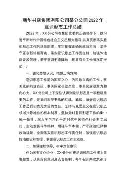 新华书店集团有限公司某分公司2022年意识形态工作总结2022年,XX分公司在集团党委的正确领导下,以习近平新时代中国特色社会主义思想为指导,认真贯彻落实意识形态工作的决策部署,牢牢把握正确的政治方向,坚持守正创新培根育魂,落实意识形态工作责任制,加强阵地建设和管理,坚守意识形态阵地,现将有关工作情况汇报如下。一、强化思想认识,把握正确方向意识形态工作是为国家立心、为民族立魂的工作,事关党的前途命运,事关国家长治久安,事关民族凝聚力和向心力。XX分公司上下深刻认识到意识形态是一项极端重要的工作,是我们新华书店的红线、底线,做好意识形态工作是我们责无旁贷的责任。坚持马克思主义在意识形态领域指导地...
