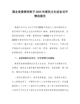 国企党委领导班子2025年度民主生活会召开情况报告根据中共中央《关于开好2025年度县以上党和国家机关党员领导干部民主生活会的通知》精神,按照省委组织部、省国资委党委统一部署,集团党委于2026年1月*日召开了2025年度领导班子民主生活会。会议紧扣主题主线,聚焦“五个带头”重点内容,坚持问题导向、严字当头,严肃认真开展批评与自我批评,达到了统一思想、增进团结、改进工作的预期目的。现将有关情况报告如下:一、会前准备扎实充分,打牢思想行动基础集团党委高度重视此次民主生活会,将其作为加强班子自身建设、推动企业高质量发展的重要契机,周密部署、精心组织,确保各项准备工作落实落细。一是深化理论学习,筑牢思想根基。会前,党委班子通过中心组集体学习、专题研讨和个人自学相结合的方式,系统重温党的二十大和二十...