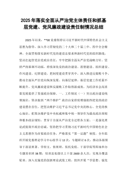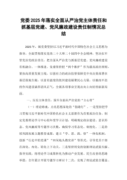 党委2025年落实全面从严治党主体责任和抓基层党建、党风廉政建设责任制情况总结2025年,镇党委坚持以习近平新时代中国特色社会主义思想为指导,全面贯彻落实党的二十大和二十届四中全会精神,坚决扛牢管党治党政治责任,把全面从严治党与抓基层党建、党风廉政建设有机融合、一体推进。党委坚持把“两个维护”作为最高政治原则,紧扣高质量发展主线,以强有力的政治监督保障党中央决策部署在基层落地生根,以富有温度的组织建设凝聚民心力量,以驰而不息的作风建设涵养清风正气,全镇各项事业呈现出向上向好的崭新局面。一、压实主体责任,筑牢全面从严治党的“主心骨”(一)理论铸魂,点亮思想深处的“指路灯”。一是坚持把学习贯彻习近平新时代中国特色社会主义思想作为首要政治任务,制定党委理论学习中心组年度学习计划,明确规定政治建设、...