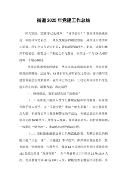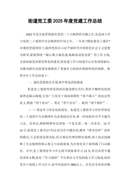 街道党工委2025年度党建工作总结2025年是全面贯彻落实党的二十大精神的关键之年,也是深入学习党的二十届四中全会精神的开局之年。一年来,*路街道党工委在*市委的坚强领导下,始终坚持以习近平新时代中国特色社会主义思想为指导,紧紧围绕“凝心聚力强党建,砥砺奋进促发展”的工作主线,全面加强党的领导和党的建设,将党建工作与街道中心任务深度融合,为推动辖区高质量发展提供了坚强有力的政治保障和组织保障。现将全年工作总结如下。一、强化思想政治引领,筑牢理论武装根基街道党工委始终将党的政治建设摆在首位,坚持不懈用党的创新理论凝心铸魂,引导广大党员干部深刻领悟“两个确立”的决定性意义,增强“四个意识”、坚定“四个自信”、做到“两个维护”。(一)理论学习常态化制度化。街道党工委将学习宣传贯彻党的二十届四中全会...