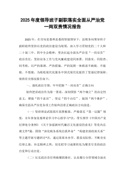 2025年度某局党委委员、副局长落实全面从严治党“一岗双责”情况报告一年来,我始终坚持以习近平新时代中国特色社会主义思想为指导,全面贯彻党的二十大和二十届历次全会精神,深刻领悟“两个确立”的决定性意义,坚决做到“两个维护”,严格落实全面从严治党“一岗双责”要求,坚持把党的政治建设摆在首位,把纪律和规矩挺在前面,把党风廉政建设与分管业务工作同谋划、同部署、同推进、同考核,切实做到业务工作延伸到哪里,管党治党责任就覆盖到哪里。现将本人2025年度落实全面从严治党“一岗双责”情况报告如下:一、突出政治统领,坚定理想信念,持续提升落实“一岗双责”的政治自觉和行动自觉一是坚持把强化理论武装作为首要任务。始终将学习贯彻习近平新时代中国特色社会主义思想作为头等大事,严格落实党委理论学习中心组学习制度,带头...