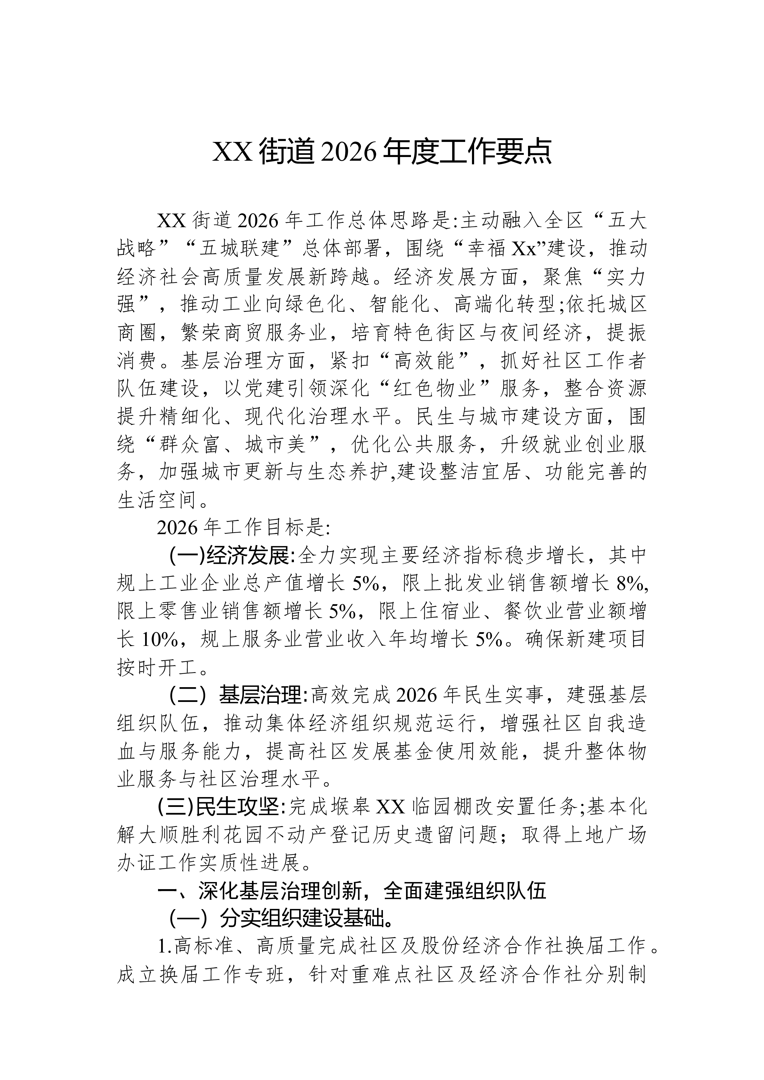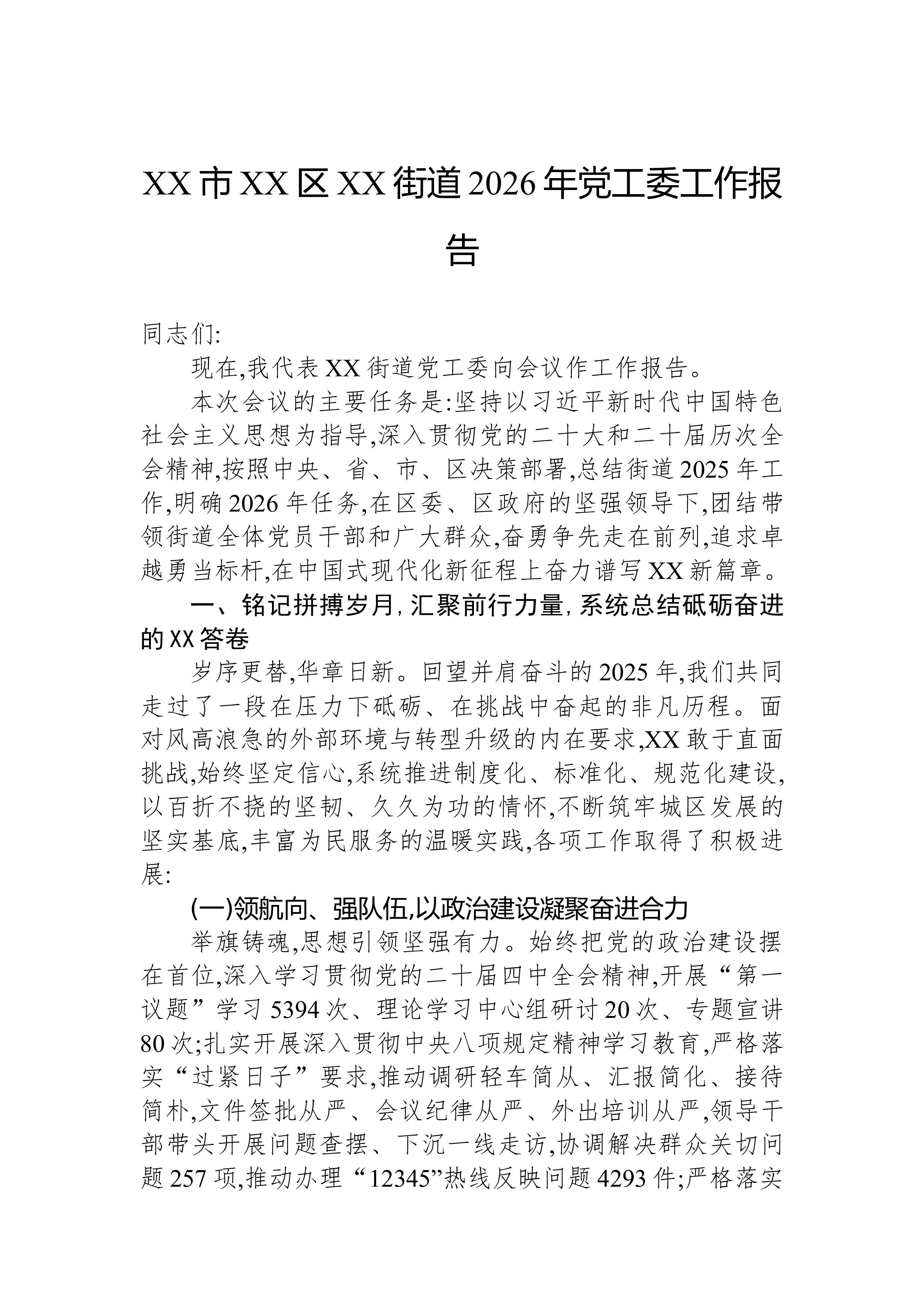 XX市XX区XX街道2026年党工委工作报告同志们:现在,我代表XX街道党工委向会议作工作报告。本次会议的主要任务是:坚持以习近平新时代中国特色社会主义思想为指导,深入贯彻党的二十大和二十届历次全会精神,按照中央、省、市、区决策部署,总结街道2025年工作,明确2026年任务,在区委、区政府的坚强领导下,团结带领街道全体党员干部和广大群众,奋勇争先走在前列,追求卓越勇当标杆,在中国式现代化新征程上奋力谱写XX新篇章。一、铭记拼搏岁月,汇聚前行力量,系统总结砥砺奋进的XX答卷岁序更替,华章日新。回望并肩奋斗的2025年,我们共同走过了一段在压力下砥砺、在挑战中奋起的非凡历程。面对风高浪急的外部环境与转型升级的内在要求,XX敢于直面挑战,始终坚定信心,系统推进制度化、标准化、规范化建设,以百折不...